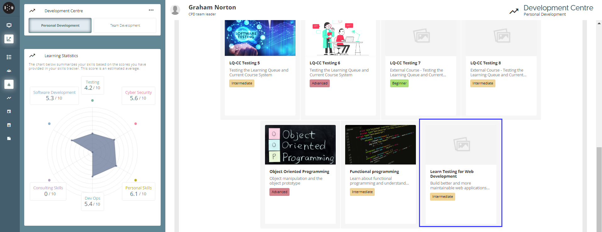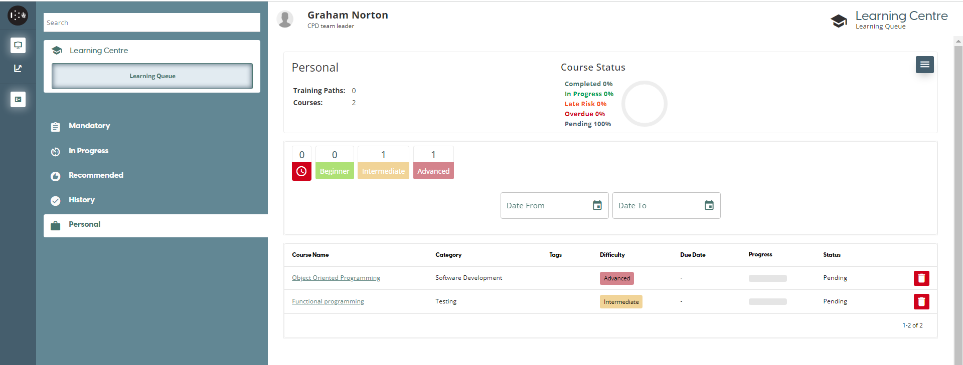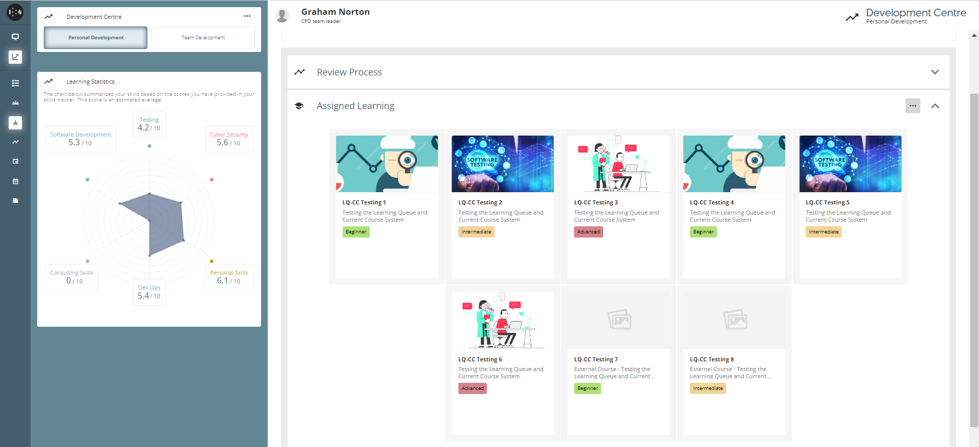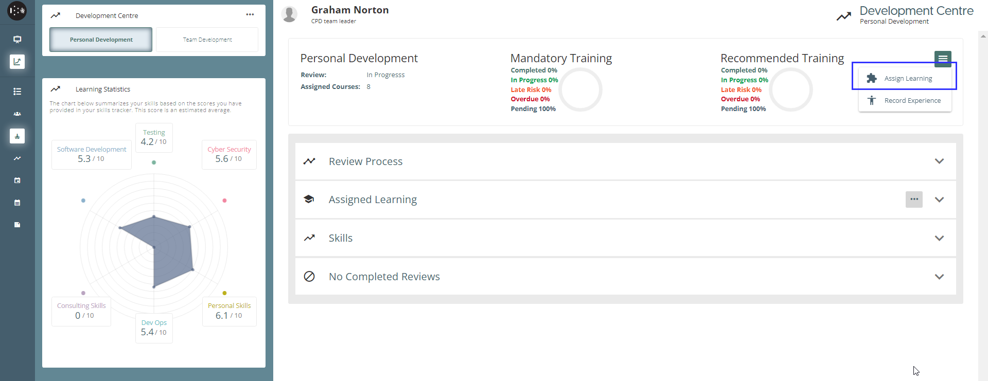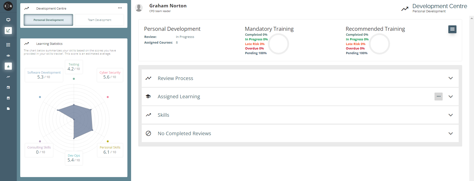Team Members and Team Leaders have a ‘Personal Development’ tab. Here, they can see their assigned learning, check the progress of their recommended/mandatory training, and review any outstanding or previous review processes.