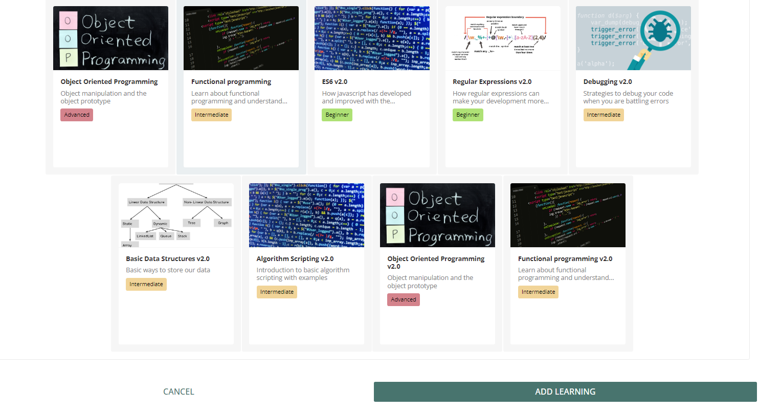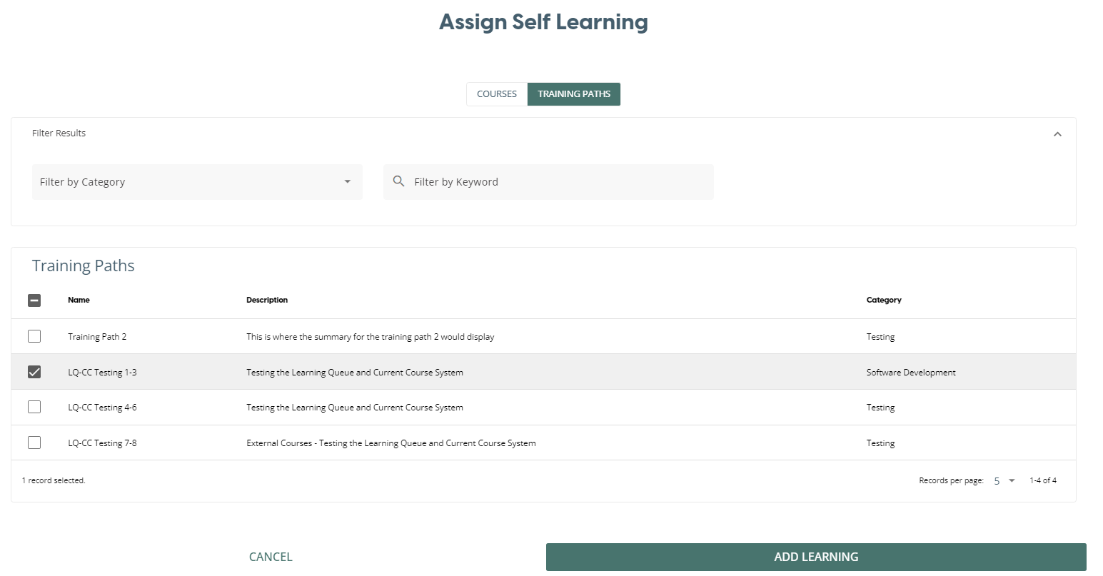 Once you are finished with your selections, you can press the “Add Learning” button at the bottom of either view to add the items to your Personal learning queue.