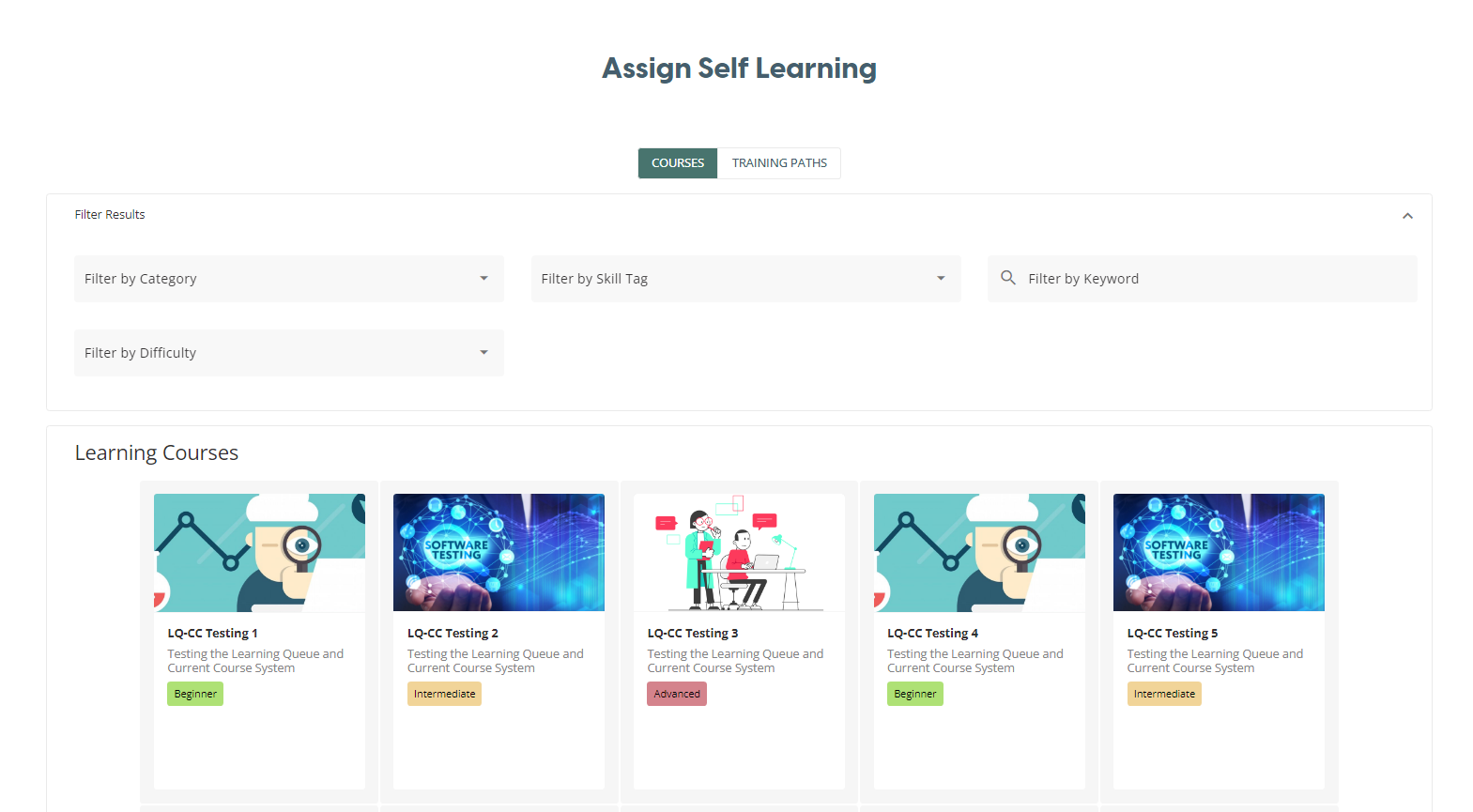 This opens the Assign Self Learning window. This window displays a list of courses that can be assigned to your personal learning queue. You can filter the results shown by clicking on the Filter results element, which gives you different attributes to filter the courses by. To select a course, just click on the icon and it will have a green tick to show it is currently selected.