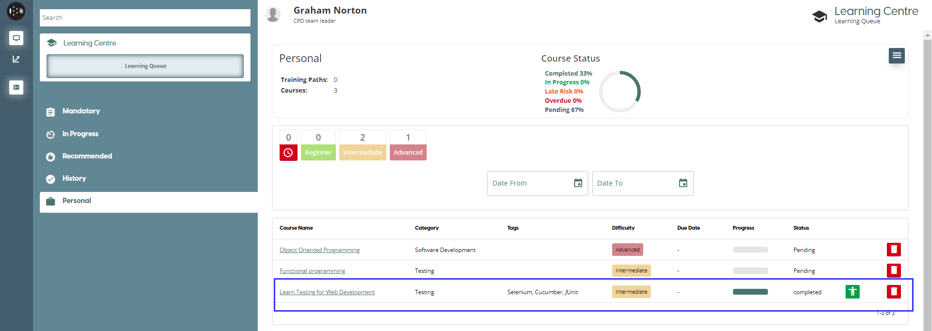 The record can also be seen if you go to the Training Portal and go to your Personal learning queue. The record can be further edited from here by pressing on the green man button, which will bring up the Edit Personal Experience window again to update the record. Any personal learning can also be removed using the red “bin” button.