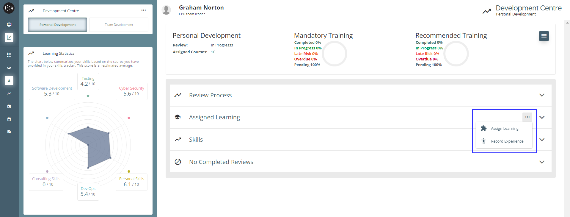 The platform also allows you to record any personal learning you have done with external sources. From the Personal Development Page, you need to press the ellipses “…” button next to the Assigned Learning header and select the Record Experience option.