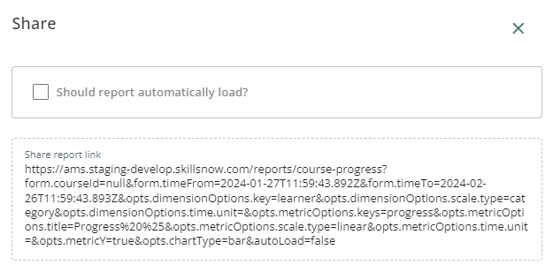 The Share Report button opens up a dialog with a URL which can be shared with others. Please note that the URL directs the individual to view the report on the platform, so the individual must have a SkillsNow account and a role with the correct permissions to view the report.