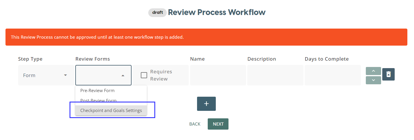 Once the review form is completed, click on the ‘SAVE’ button and the review form will be ready for selection in the Review Process Workflow builder page.