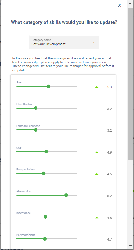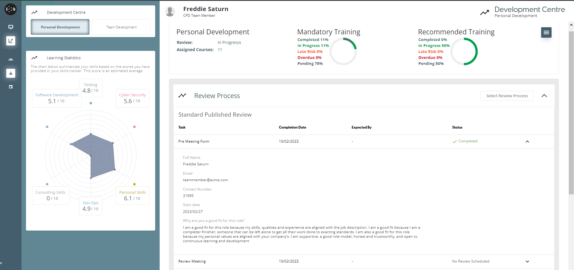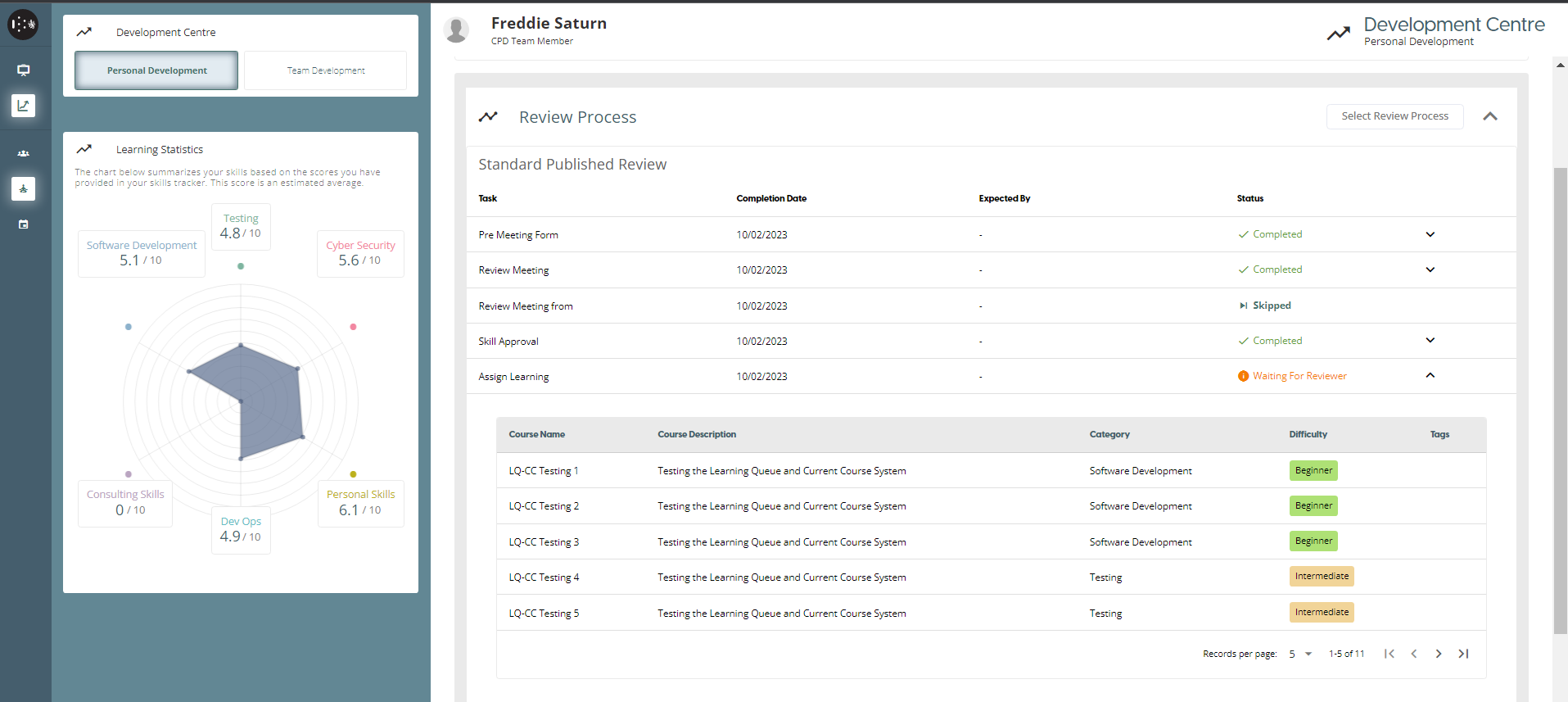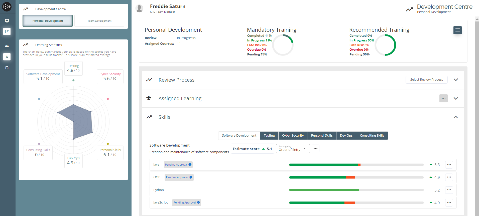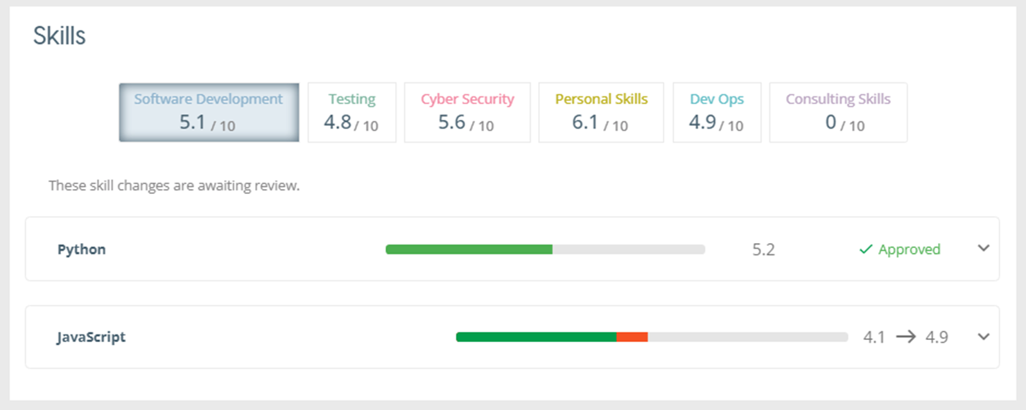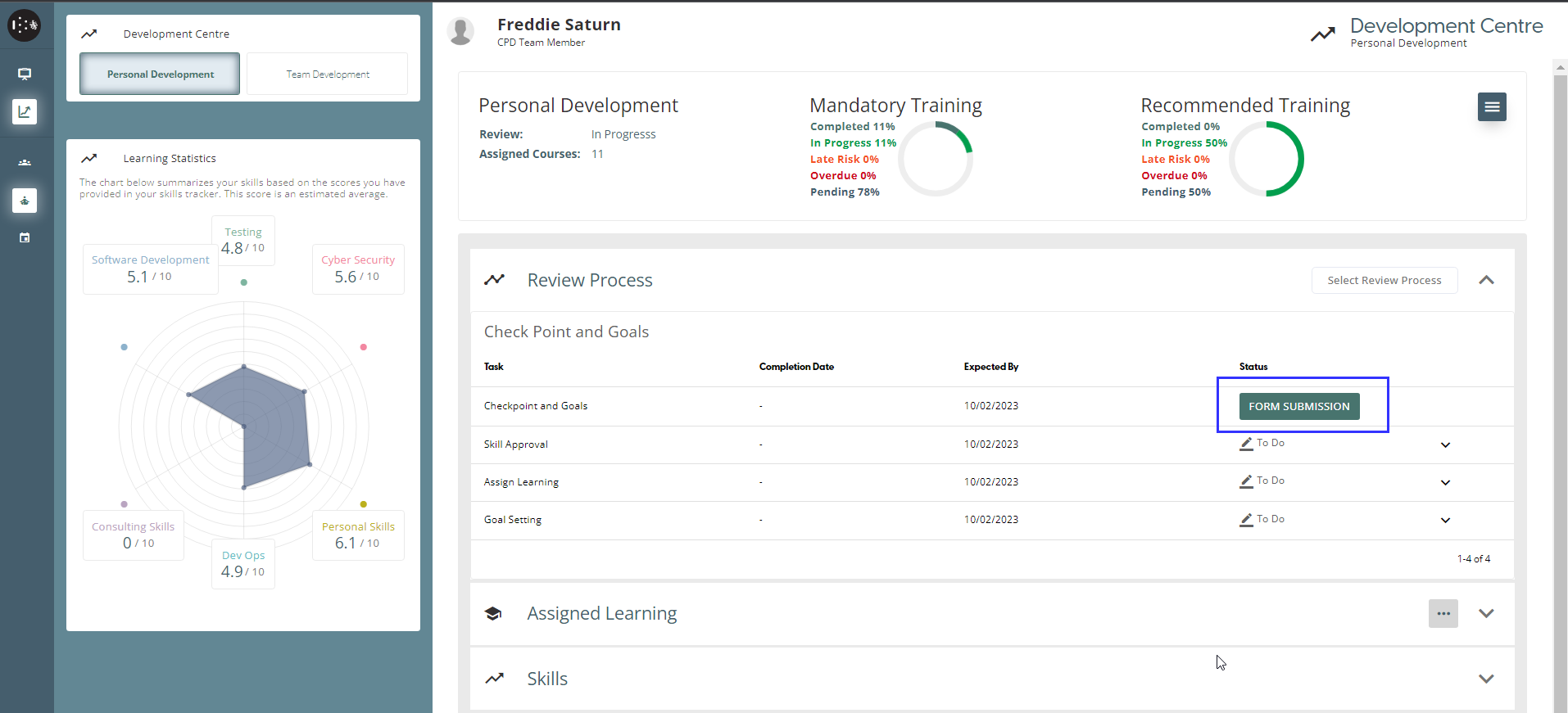 On the Personal Development page, the user can document their new skills. Once they have acquired a new skill, they can list it on this page and provide a rating for it between 1 and 10, and also record any sub-skills. Any new skills and the scores will be presented in the Learning Statistics graph. When a user’s task in the Review Process is a “Skill Review”, added skills by the user will be sent to Reviewer for Approval.