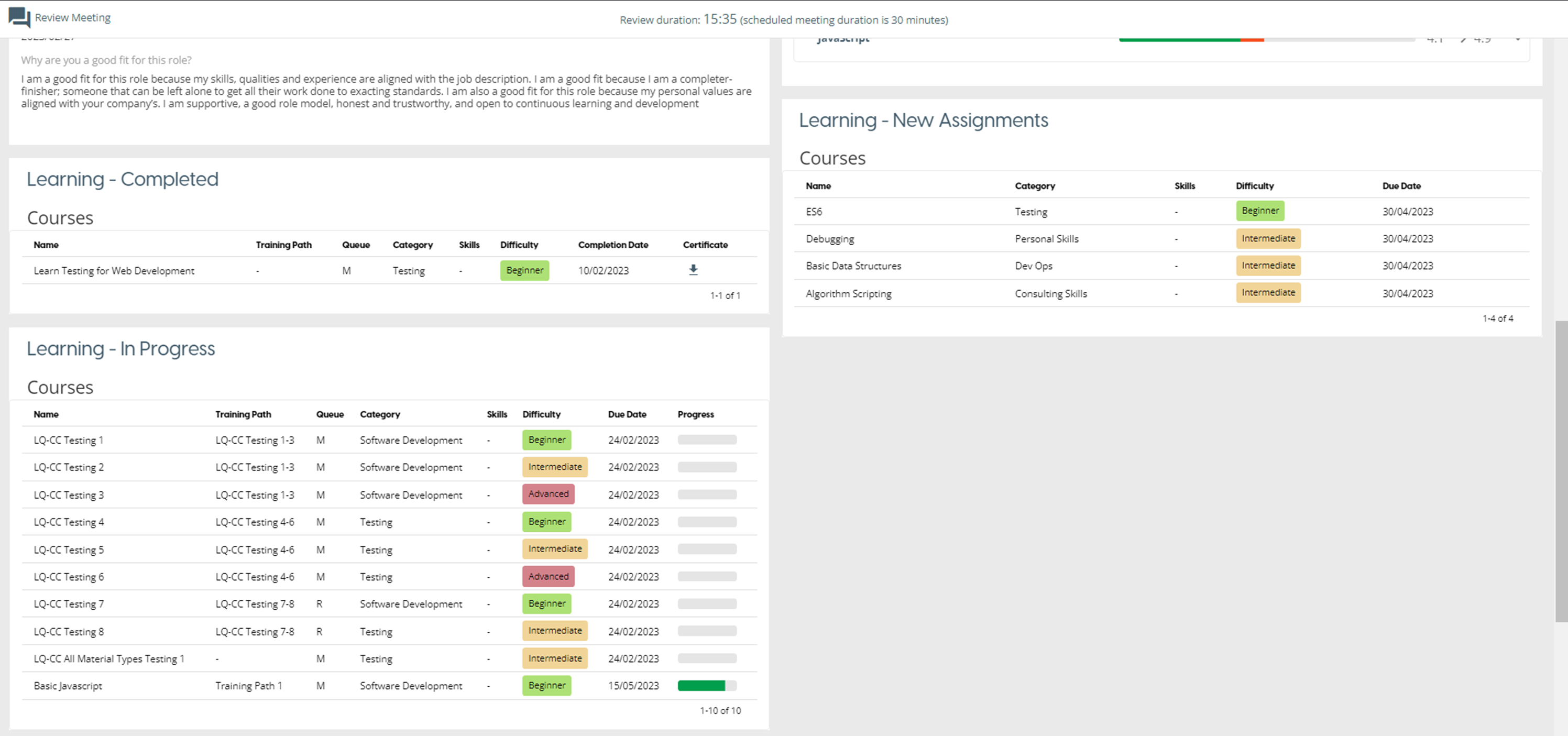 All the team member’s assigned learning is displayed. Team leader can also see new courses added by the Team Leader during the review meeting and added courses will be moved to In Progress table when the team leader approved them.