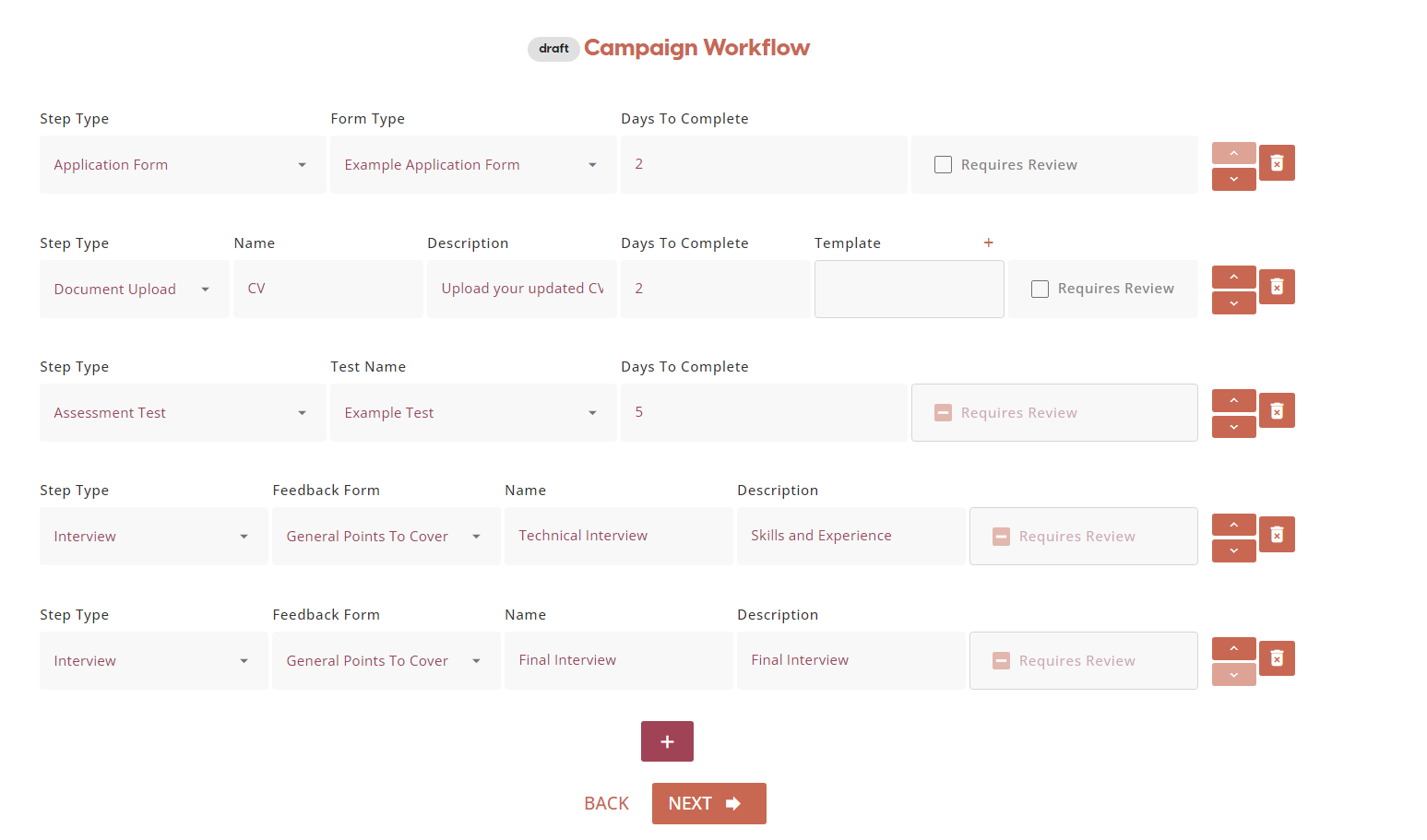A campaign is used to track applicants for a given role and configure the workflow of an applicant through the application process.