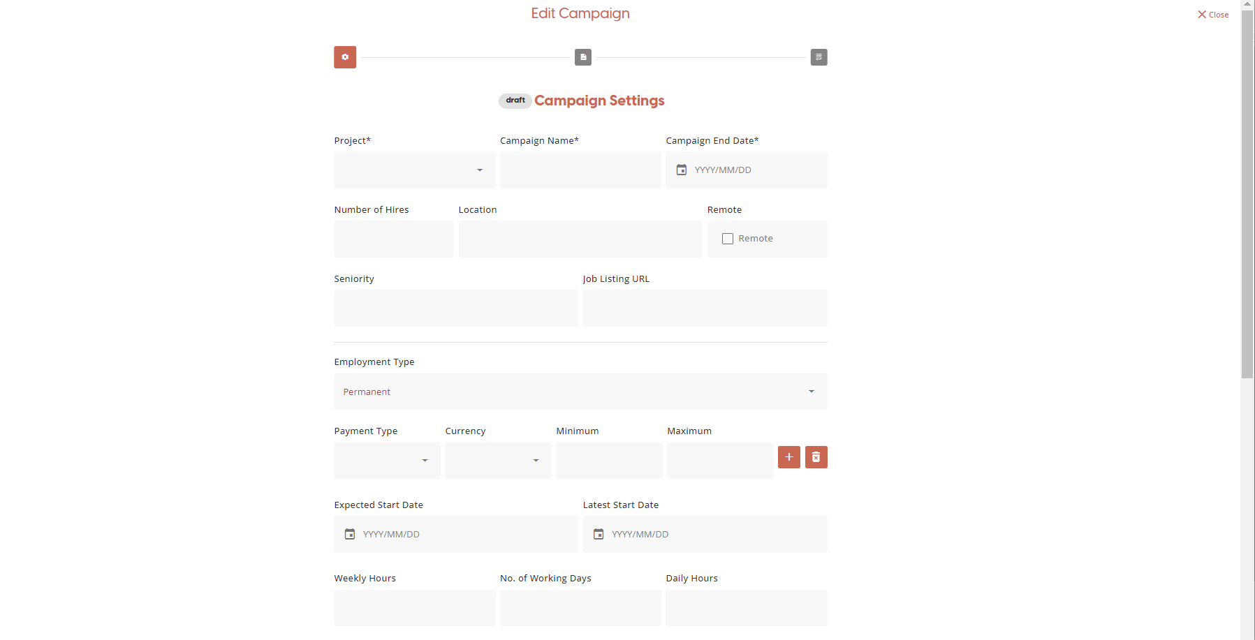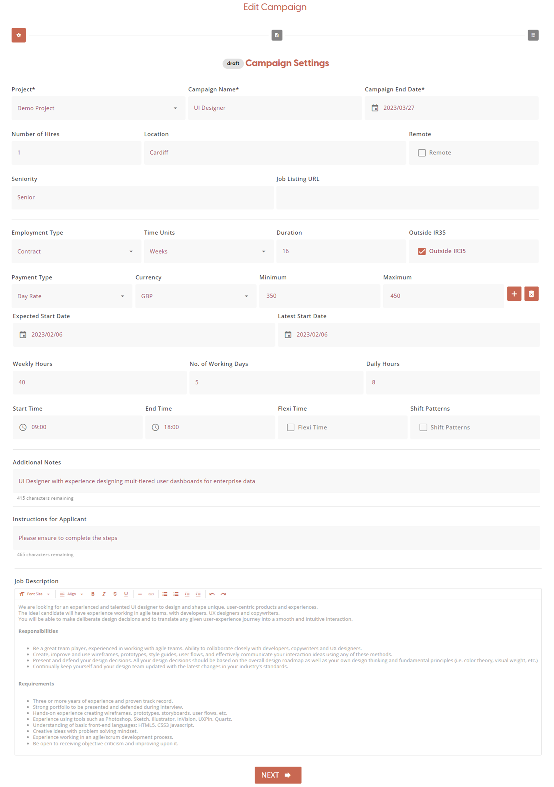 On the Campaign Settings form you can enter a range of details relating to the job listing you are configuring for applicants to apply for.