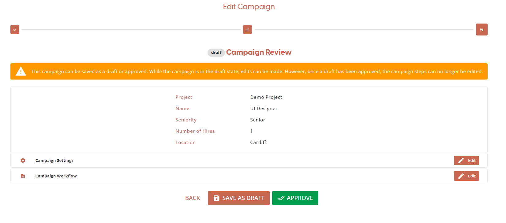 At the review stage you can edit any of the previous configuration steps and choose to “Save as Draft” or “Approve” the current campaign. Approving the campaign will make the job listing live and allow the recruiter to share a link with prospective candidates to enable them to start the process.