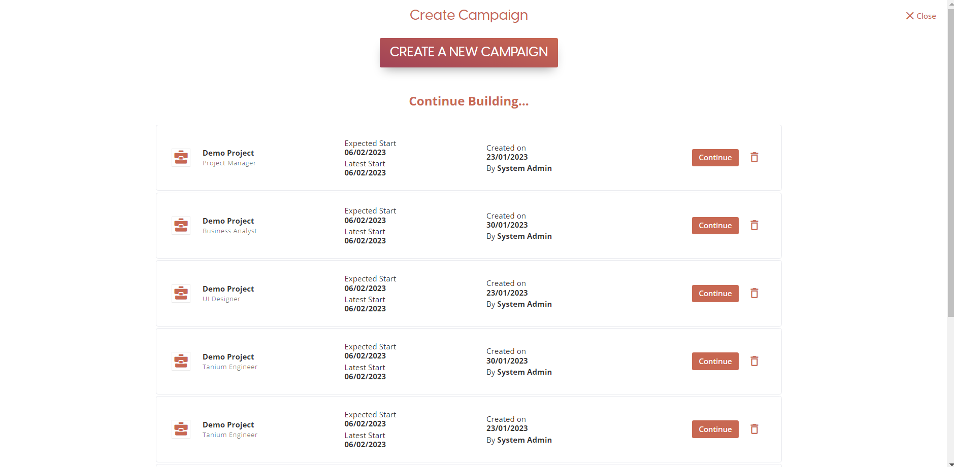 Within the Recruitment portal, select campaigns. On Campaign list in the left panel and select the “Create Campaign” button.