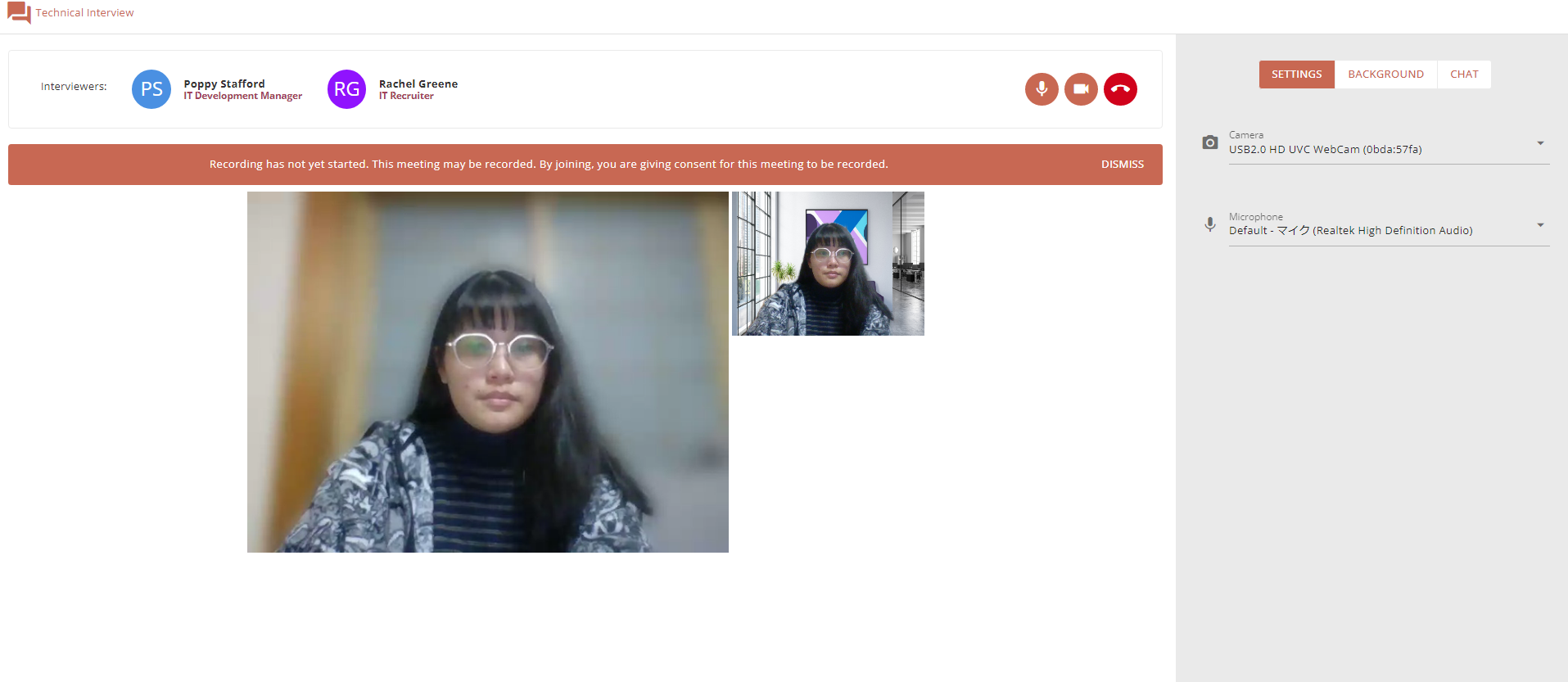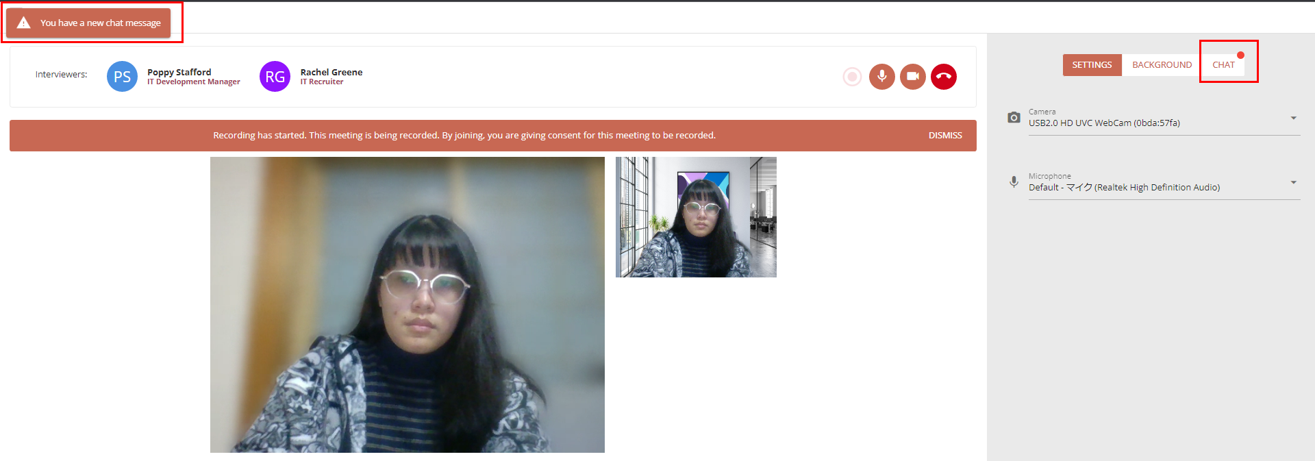 The applicant will be notified when recording has started with a message and by the appearance of a red icon next to the microphone mute button.