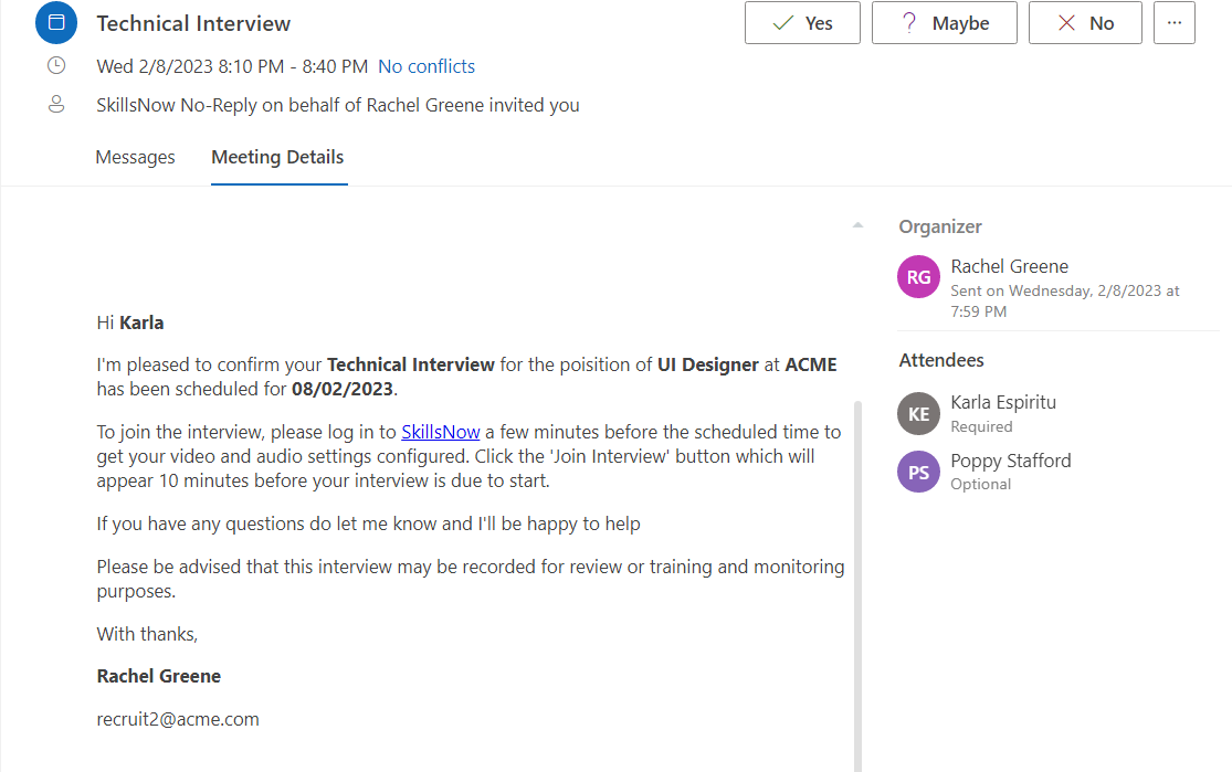 Applicants will receive an email inviting them to be interviewed, this will contain an ICS appointment that can be saved to their calendar.