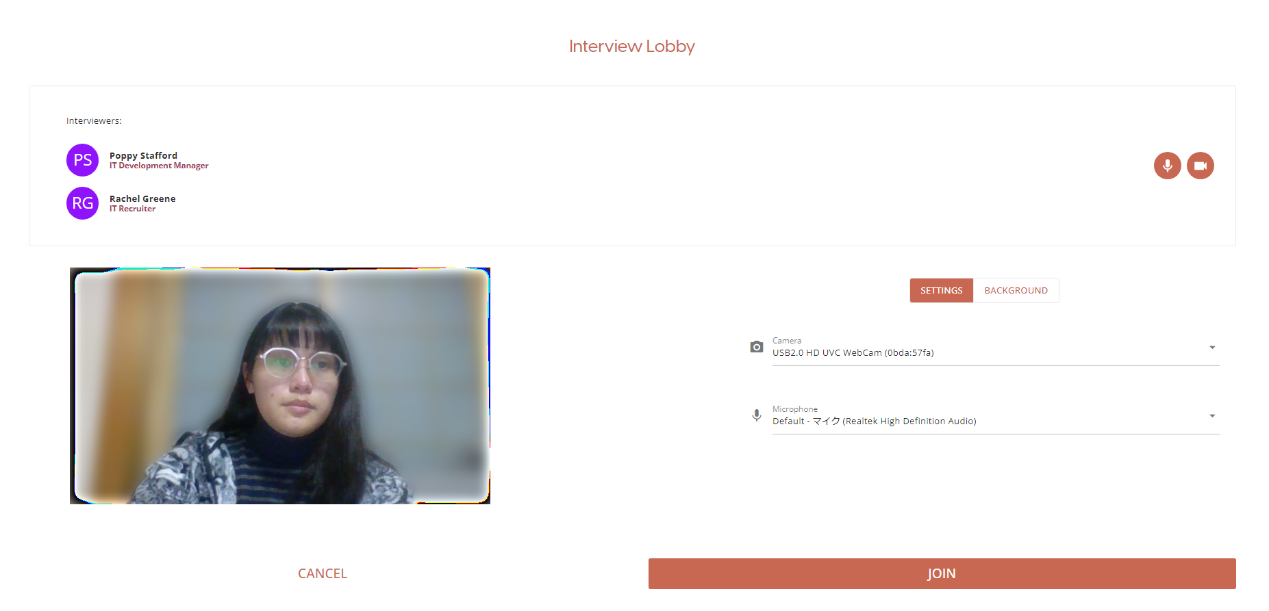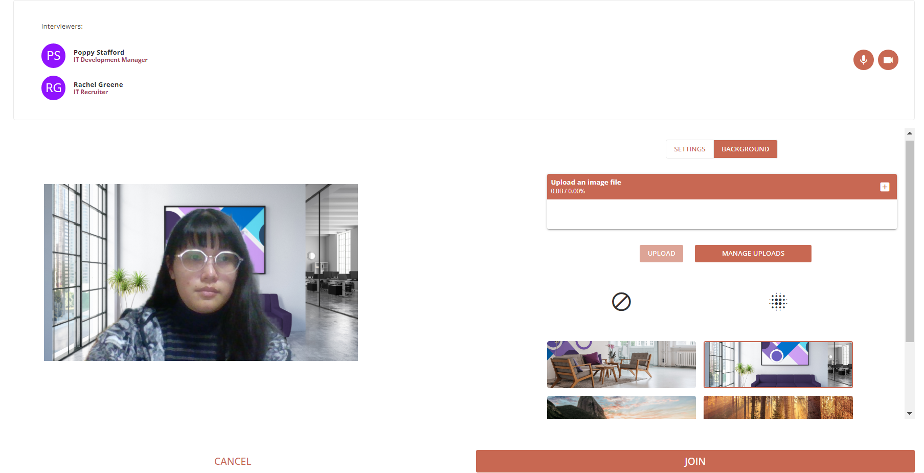 On the background tab, users can select which background option they would like to apply for their video. They can select an image from the image gallery, or they can upload their own image by selecting the ‘+' button, then clicking 'UPLOAD’. Once they are happy with their background settings, they can join the interview.