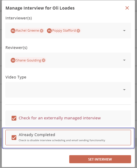 If the interviewer is hosting an external interview, then they might want to schedule the interview and send email correspondence about the interview outside of the platform. If they do not want the system to automatically schedule in and send an email for the interview, then the interviewer should select the second box to remove the email and scheduling functions.