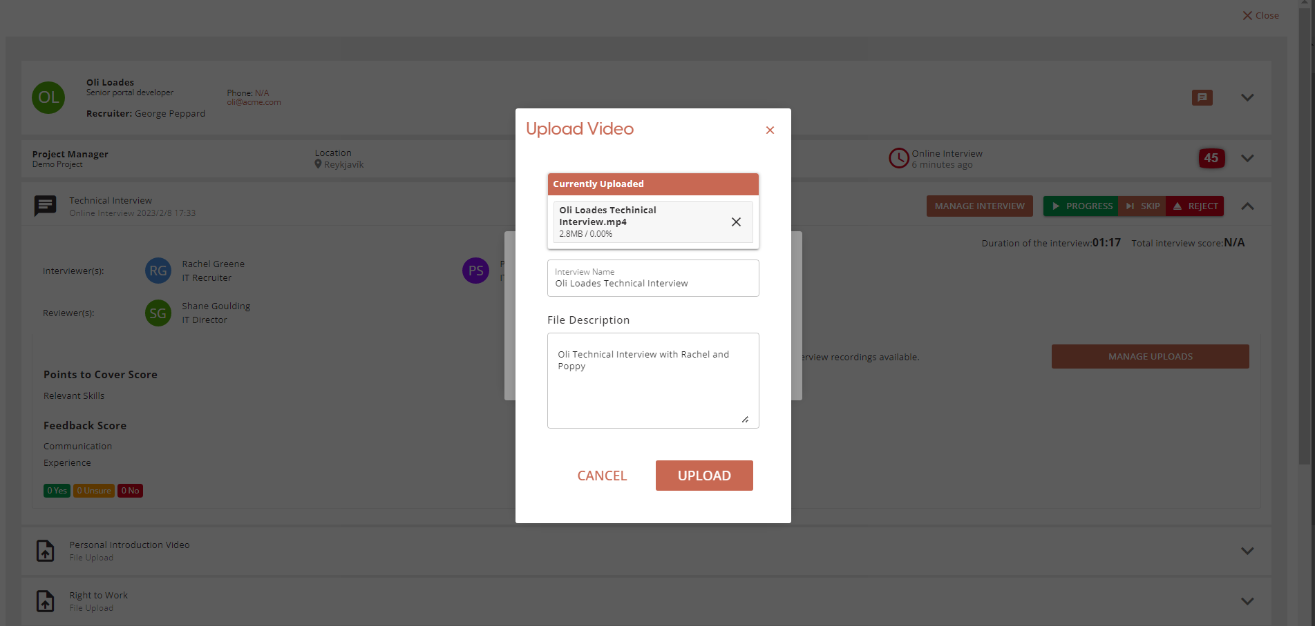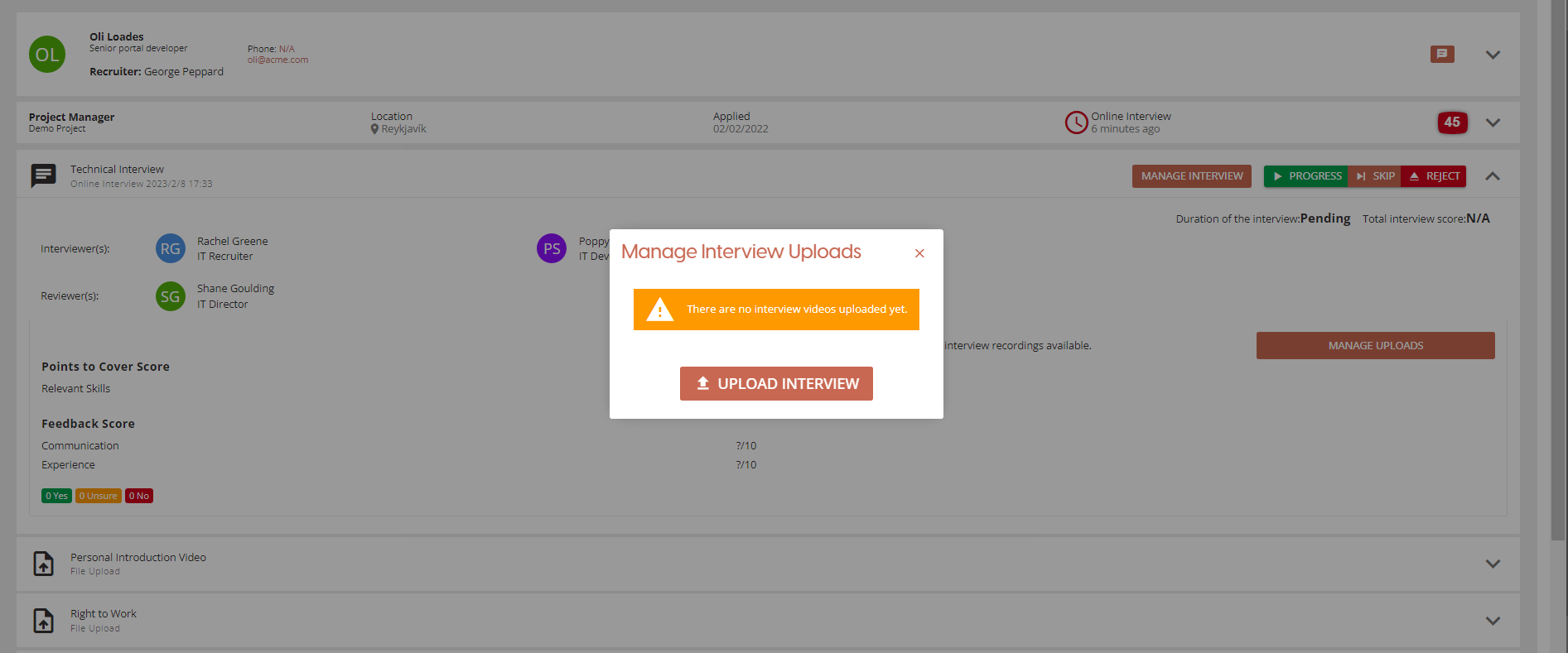 To upload a recording of the interview select the “MANAGE UPLOADS” button on an application in the recruitment portal.