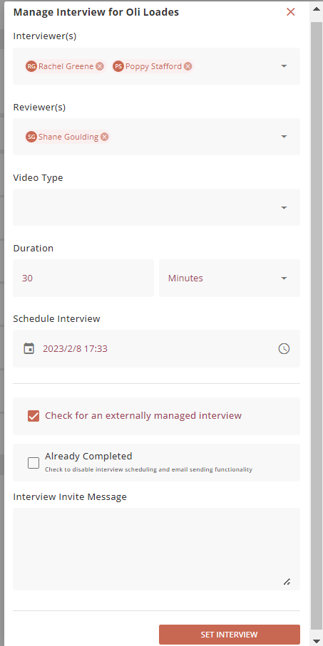 The interviewer is responsible for setting up the interview in the external software and inviting the applicant.