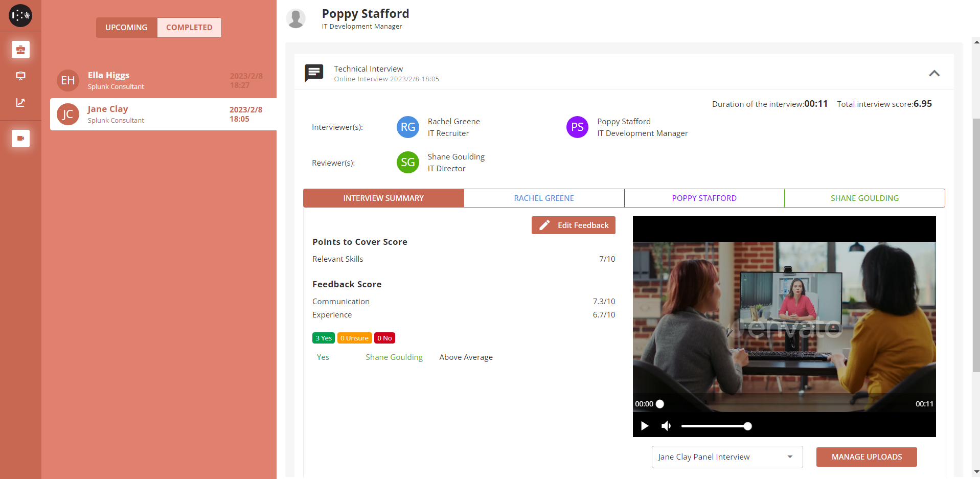 When a reviewer logs-in they are able to see a list of interviews to be reviewed, they can also see a list of interviews that have had their feedback completed.