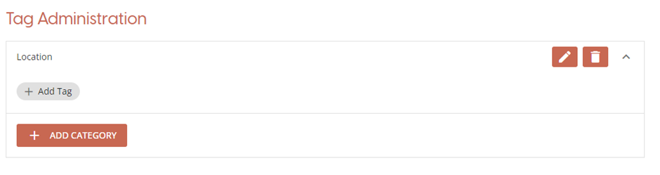Once the user clicks save, the tag category will be put into the Tag Administration section. Once there is a category the recruitment admin will have several options available for each category. Clicking on the pencil icon will bring up a dialog which lets the user re-name the category, while the bin icon will delete the category. However, a tag category can only be deleted if there are no tags associated with that category, and the bin icon will remain disabled until this condition is met.