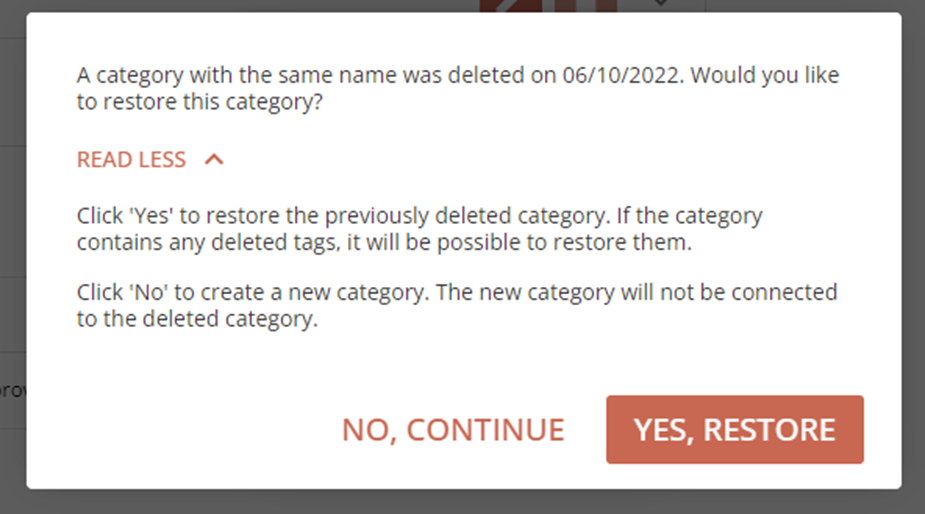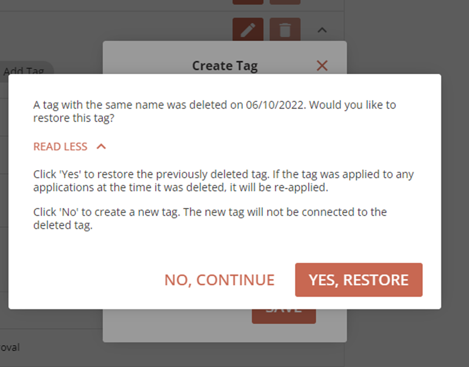 When adding a tag that has an identical name to the same category, the platform will give the user an option to restore the tag to its previous status before deletion. A pop-up window will appear giving the user details of each choice and what it means for applications.