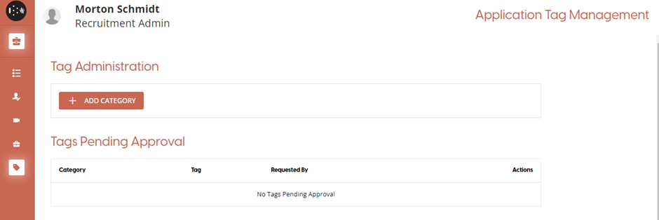 Tags can also be created by other users with the recruiter role, but those tags must be approved by the recruitment admin. Once a tag has been requested by a recruiter it will appear in the Tags Pending Approval section.