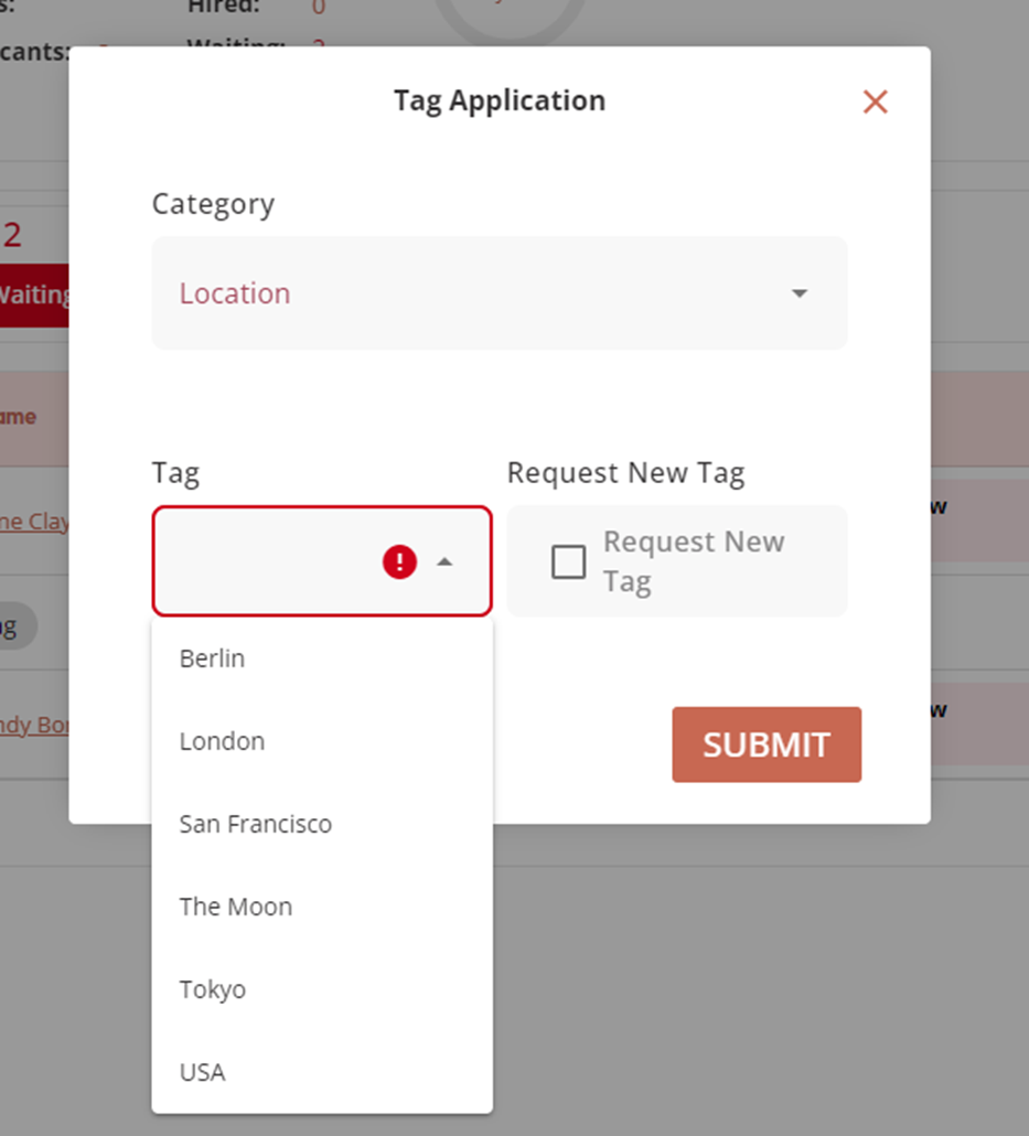 In this section there is a ‘+ Add Tag’ button which opens a new pop-up window. In this window the recruiter will first have to pick a category from the dropdown menu.
