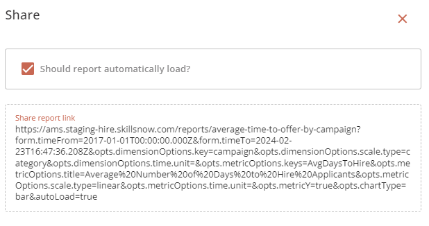 The Share Report button opens up a dialog with a URL which can be shared with others. Please note that the URL directs the individual to view the report on the platform, so the individual must have a SkillsNow account and a role with the correct permissions to view the report.