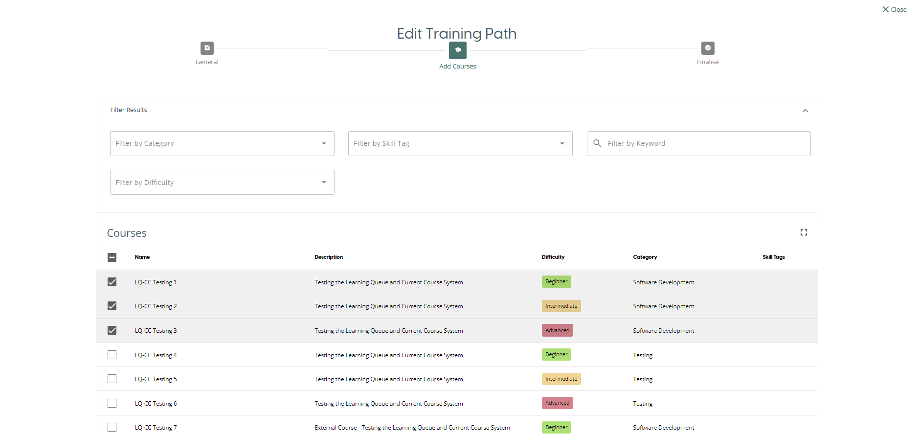 This will then open up the Training Path editor dialog on the General setting page, allowing you to start editing details of the training path. On the next page, you will be able to edit the courses associated with the training path, with the previously selected courses already checked. You can add or remove courses on this step.