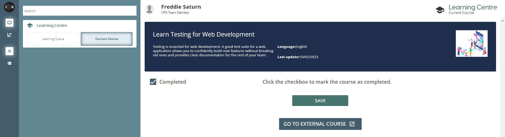 Once a user has finished an external course, they can check the course as completed and will be presented with a button to save their progress.