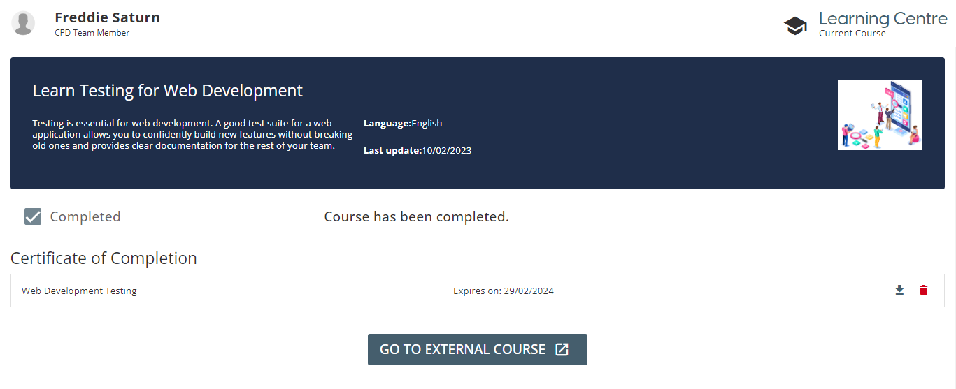 Once the user then clicks on upload, they will see a new section on the completed course page that displays then uploaded certificate and its expiry date. The icons allow the user to then download a copy of the certificate or to delete it.
