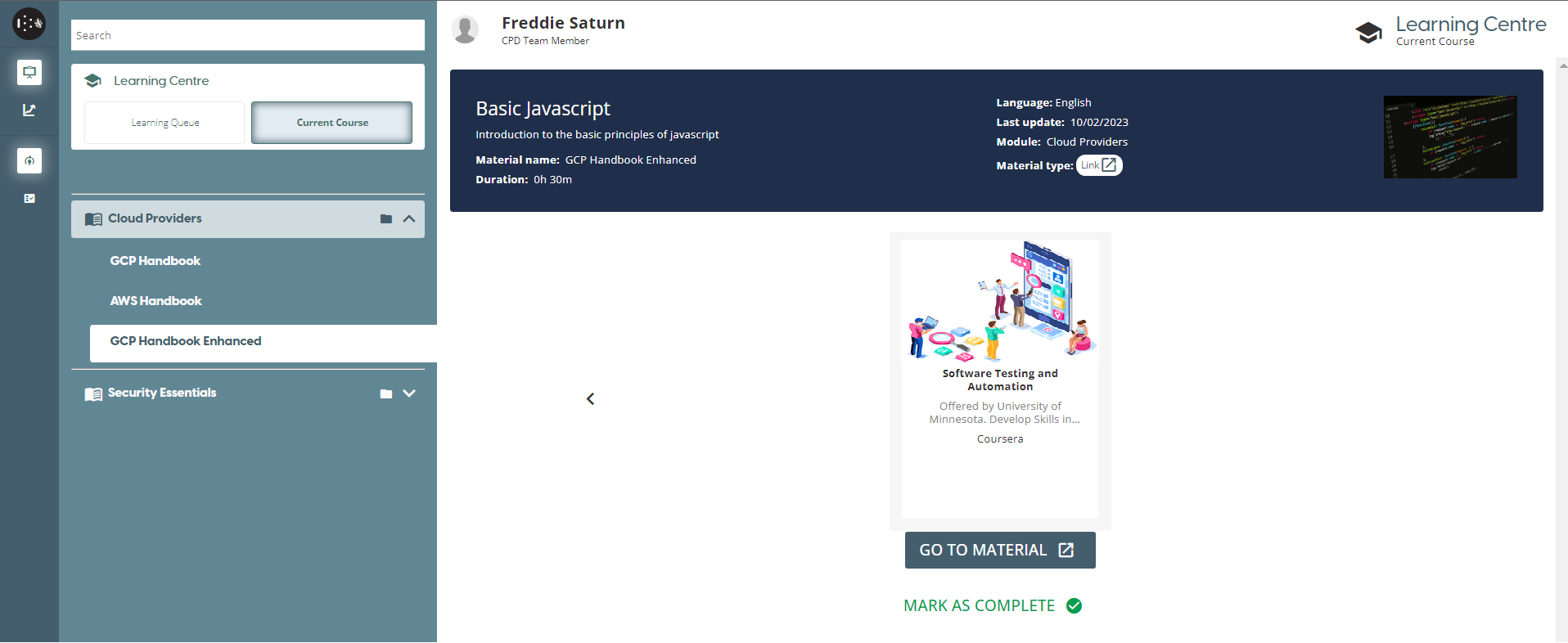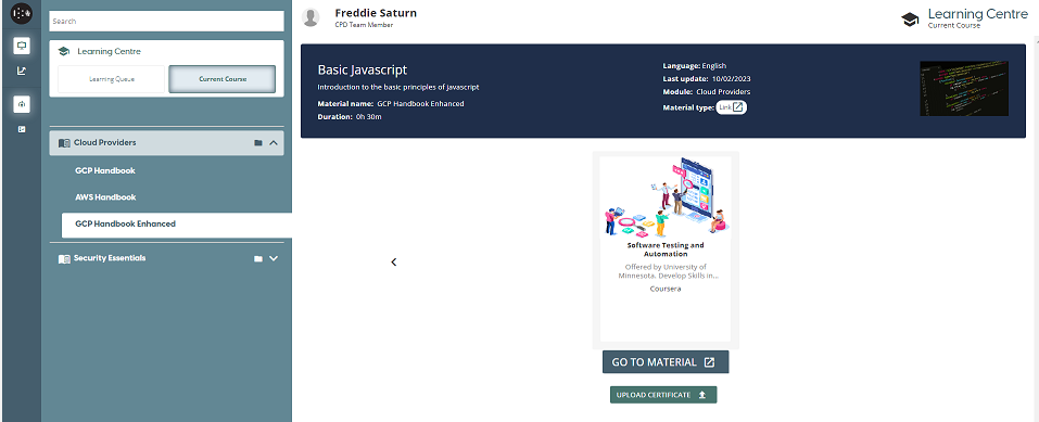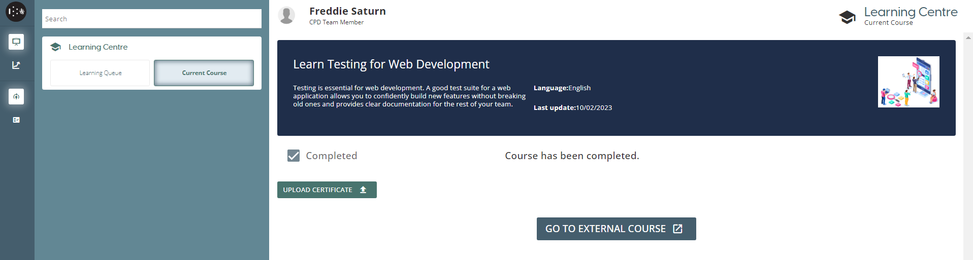 When accessing the course page again via the learning queue, the user will see a new ‘Upload Certificate’ button on the page.